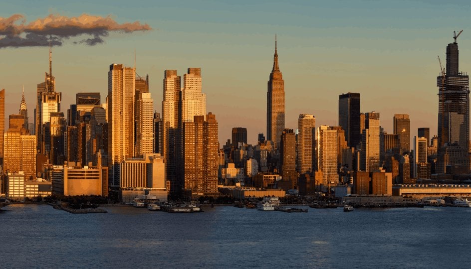 An aerial view of New York City skyline at sunset, with One World Trade Center