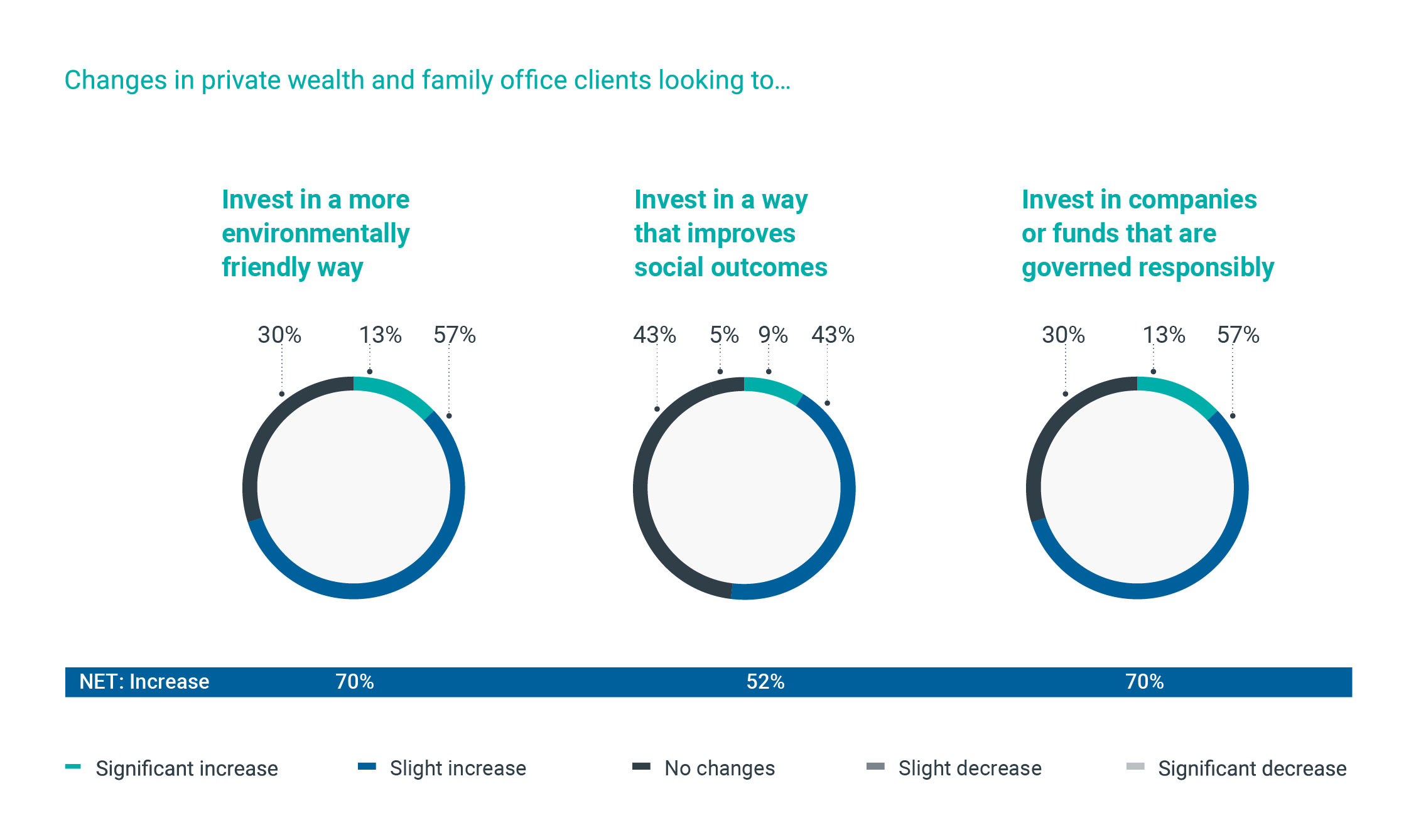 Private wealth and family office services are increasingly taking environmental practices into consideration. Clients have been increasingly investing in environmentally friendly practices over the past year in 70% of jurisdictions.