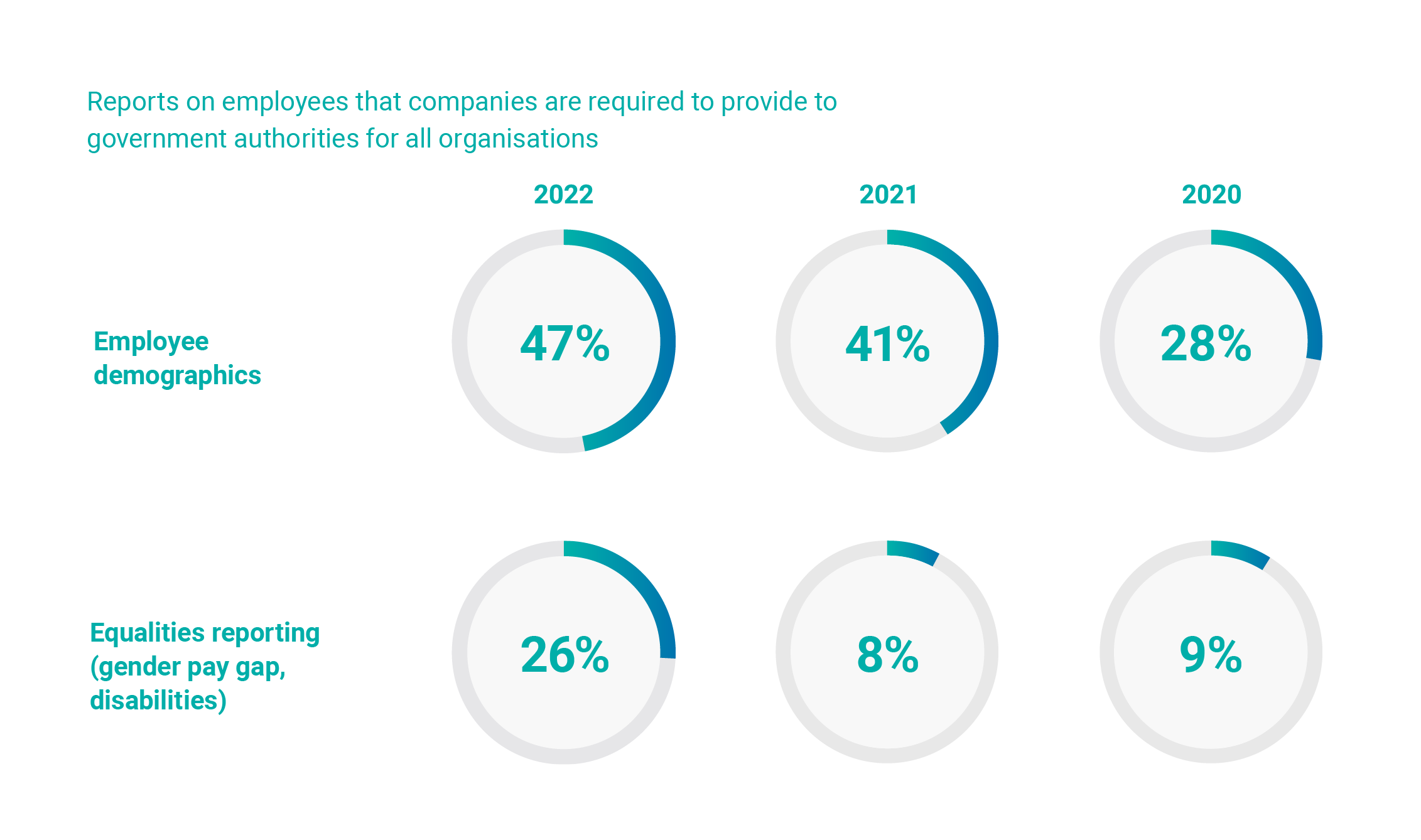 Companies are also required to submit reports and information related to equality, covering areas such as gender pay gap and disabilities, in more jurisdictions – up to 26% in 2022 from 9% in 2020.