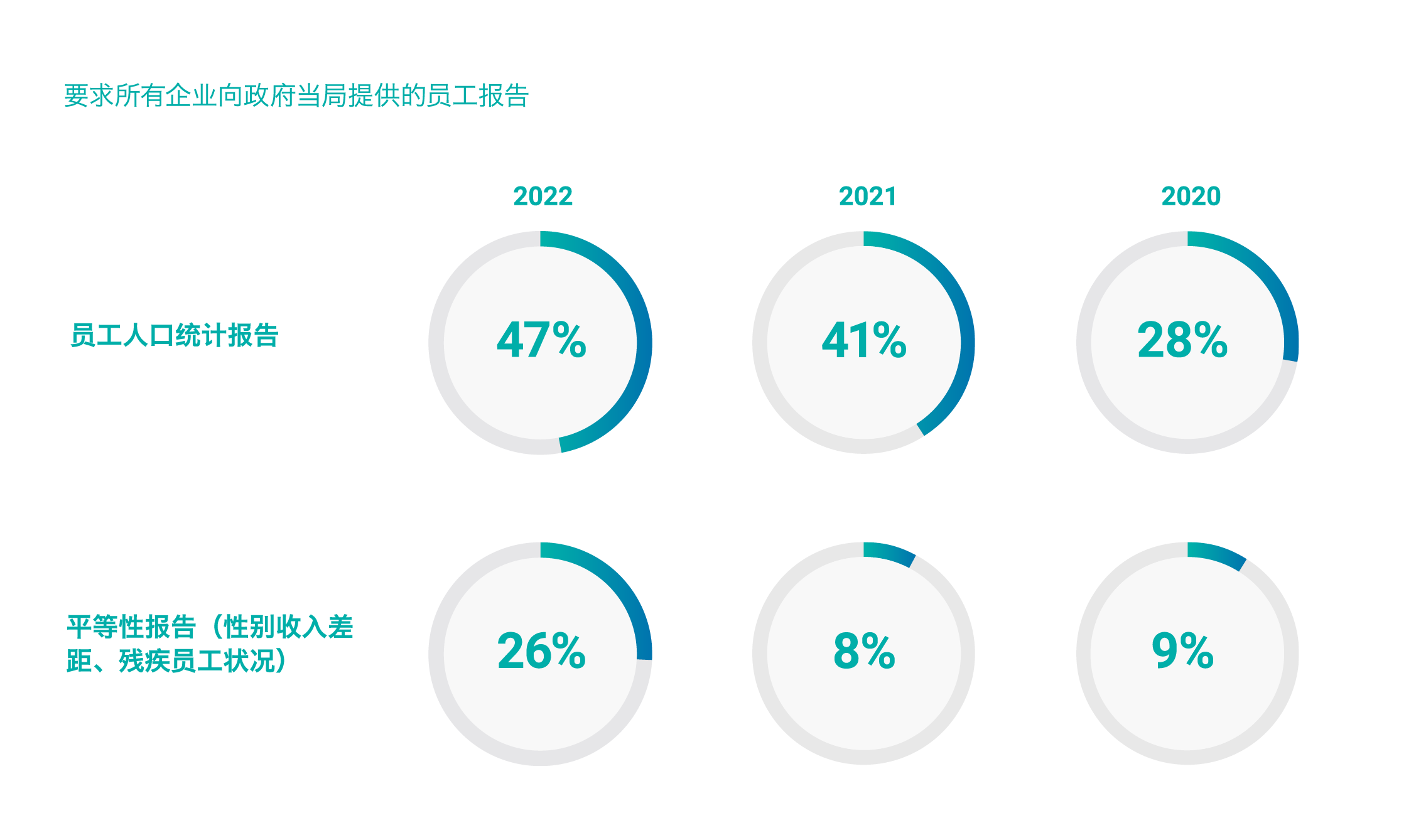 要求企业提交平等性报告及信息的司法管辖区比例增加,从2020年的9%上升到2022年的26%,报告内容涵盖性别收入差距、残疾员工状况等。