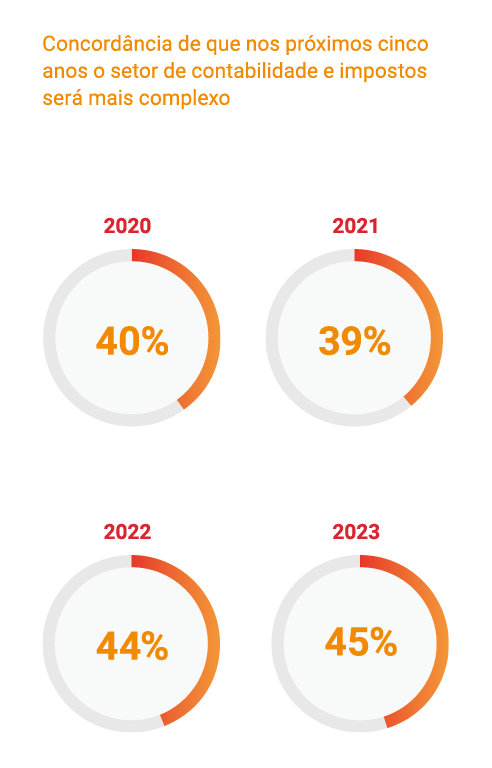 No entanto, estas duas áreas estão se tornando mais complexas ano após ano. Em 2020, 40% dos experts em contabilidade e impostos da TMF Group em todo o mundo afirmaram que previam que o compliance se tornaria mais complexo nos próximos cinco anos. Este índice cresceu de maneira contínua, atingindo a marca de 45% em 2023, demonstrando que muitas organizações estão enfrentando uma carga operacional maior do que há três anos – e que ela pode se tornar mais onerosa nos próximos anos.