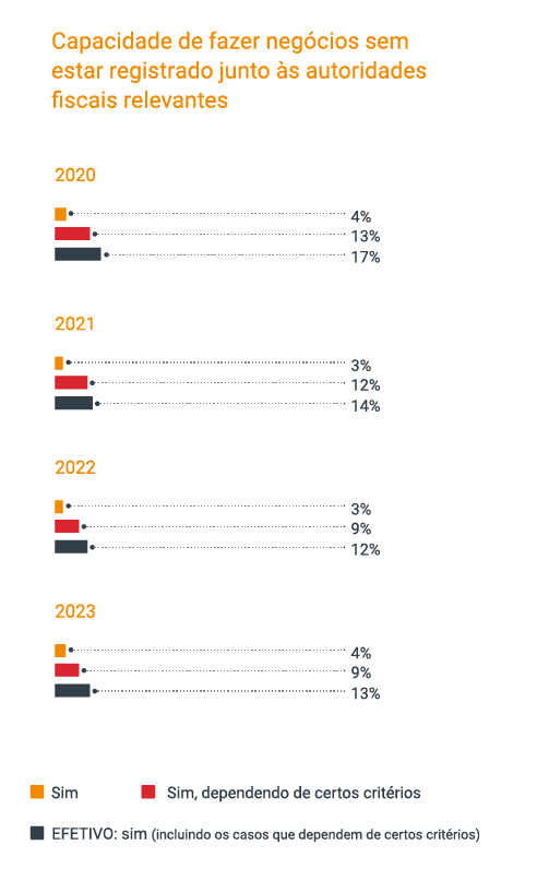 A cada ano, as regras contábeis e fiscais estão se tornando mais restritivas. Um exemplo disso é que agora é menos comum poder fazer negócios sem estar registrado junto às autoridades fiscais relevantes: isso só é possível em 13% das jurisdições em todo mundo em 2023. Este número inclui jurisdições como as Ilhas Cayman e os EUA, onde fazer negócios é normalmente mais simples e os governos trabalham ativamente para tornar as etapas de constituição e operação de um negócio as mais simples possíveis.