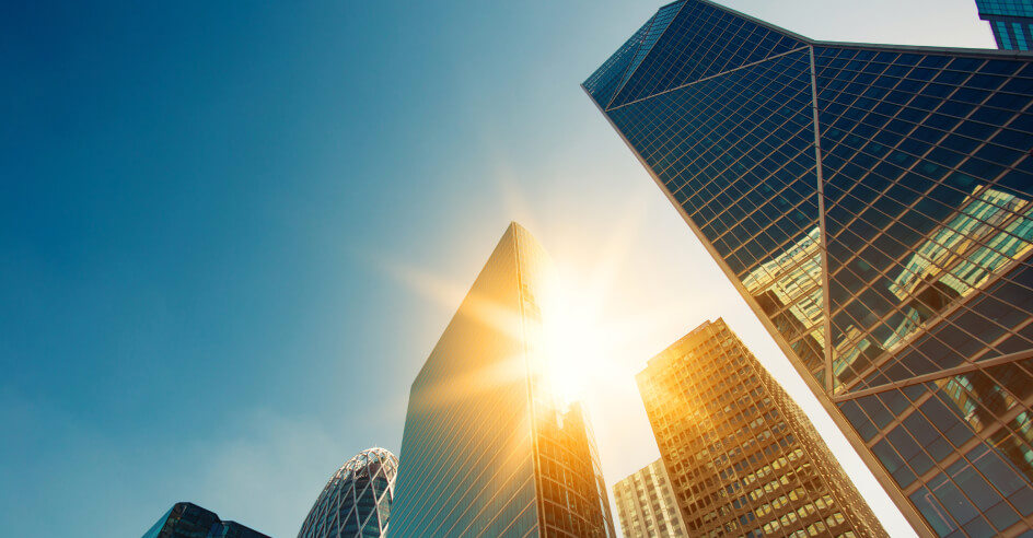 Skyscraper glass facades on a bright sunny day with sunbeams in the blue sky