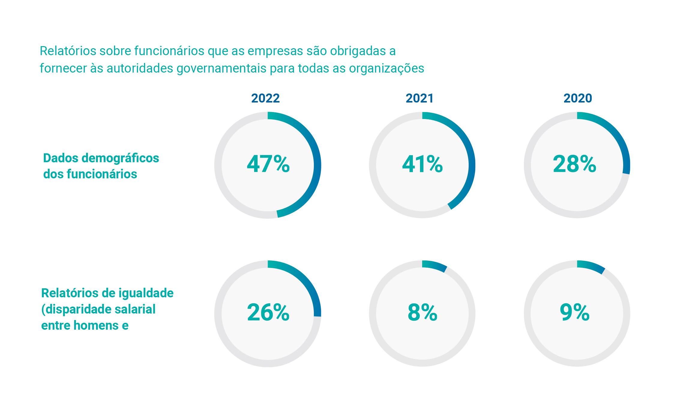 As empresas também são obrigadas a enviar relatórios e informações relacionadas à igualdade, abrangendo áreas como disparidades salariais de gêneros e de deficiências, em mais jurisdições – até 26% em 2022 e 9% em 2020.