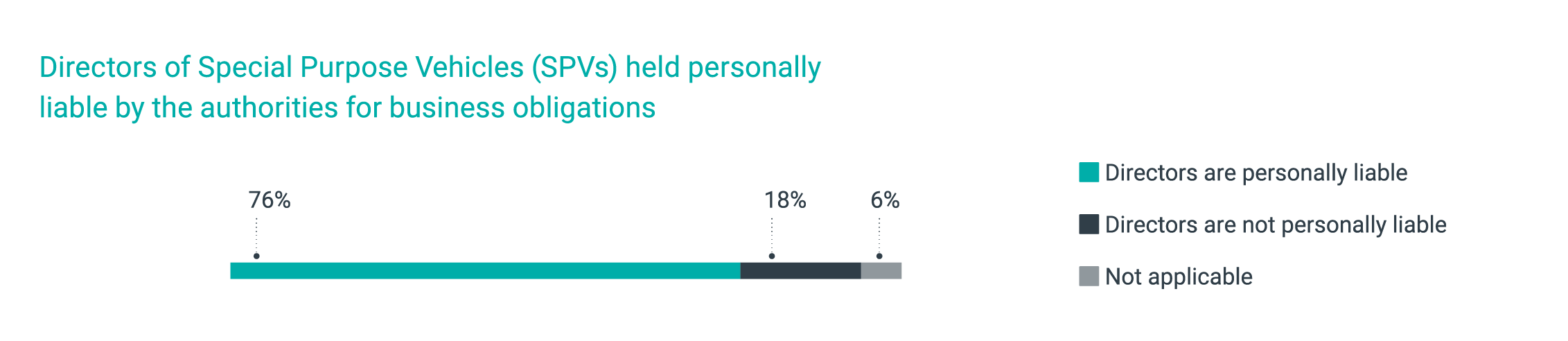 Three quarters of jurisdictions (76%) report that directors of Special Purpose Vehicles (SPVs) can be held personally liable for business obligations, linking to a focus on transparency and a focus on adherence to local laws and legislation.