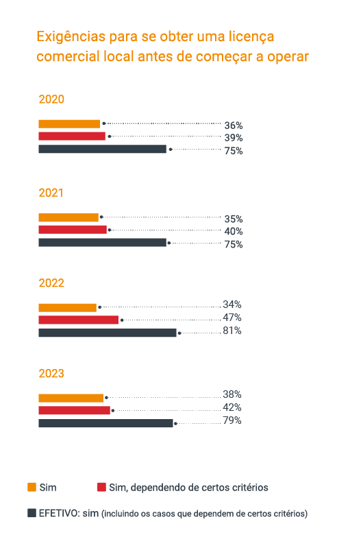 A cada ano, as regras contábeis e fiscais estão se tornando mais restritivas. Um exemplo disso é que agora é menos comum poder fazer negócios sem estar registrado junto às autoridades fiscais relevantes: isso só é possível em 13% das jurisdições em todo mundo em 2023. Este número inclui jurisdições como as Ilhas Cayman e os EUA, onde fazer negócios é normalmente mais simples e os governos trabalham ativamente para tornar as etapas de constituição e operação de um negócio as mais simples possíveis.