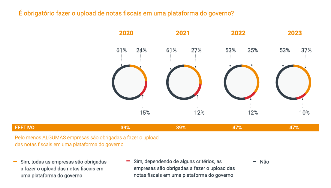 Desde 2020, tornou-se cada vez mais comum que os governos exijam a emissão e o upload de notas fiscais digitalmente. Por exemplo, em 2020, apenas 38% das jurisdições exigiram que pelo menos algumas organizações emitissem notas fiscais eletronicamente, um índice que aumentou para 53% em 2023. Da mesma forma, em 2020, apenas 24% das jurisdições exigiram que todas as organizações fizessem o upload de notas fiscais em uma plataforma do governo, um número que aumentou para 37% em 2023.