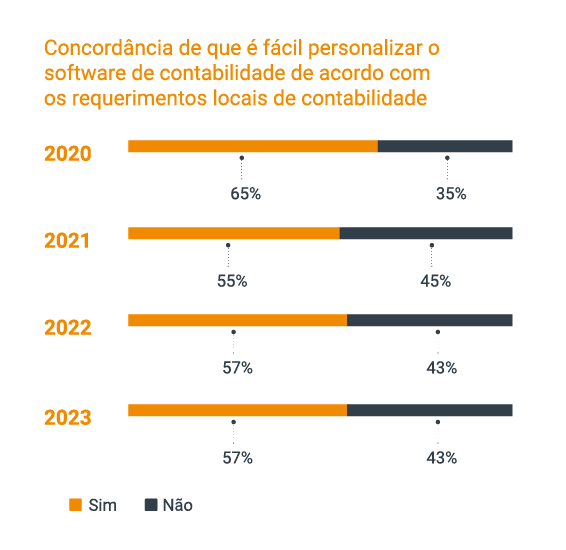 Por outro lado, a digitalização também pode gerar sua própria complexidade. Por exemplo, está se tornando mais difícil personalizar softwares de contabilidade de acordo com os requerimentos locais, com 43% dos experts nas jurisdições destacando que não é algo simples de ser feito, contra um índice de 35% em 2020. Isso demonstra que, à medida que a digitalização se torna mais integrada internacionalmente, as organizações podem enfrentar desafios para ajustar seus softwares de contabilidade e impostos de acordo com o que é exigido localmente.